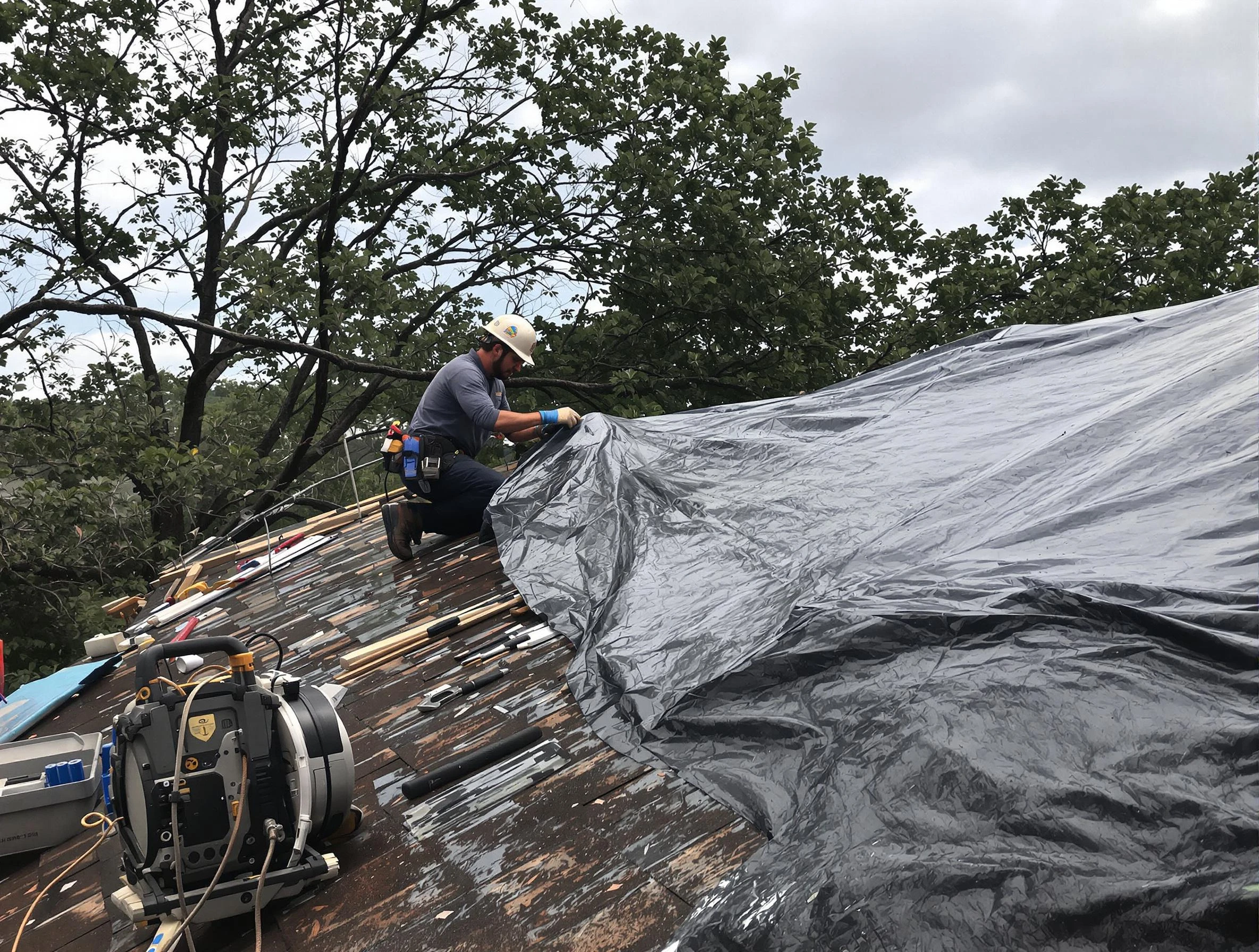 We use tarping and other protective methods to minimize water intrusion while performing essential temporary fixes, returning for permanent repairs once it's safe.